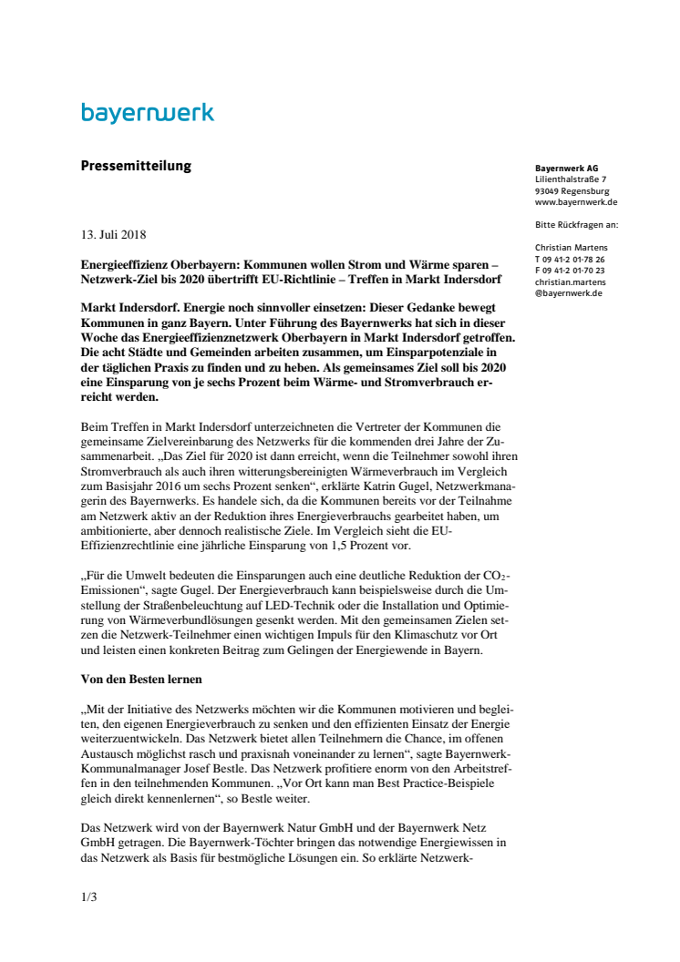 Unter Führung des Bayernwerks hat sich in dieser Woche das Energieeffizienznetzwerk Oberbayern in Markt Indersdorf getroffen. Die acht Städte und Gemeinden arbeiten zusammen, um Einsparpotenziale in der täglichen Praxis zu finden und zu heben. Als gemeinsames Ziel soll bis 2020 eine Einsparung von je sechs Prozent beim Wärme- und Stromverbrauch erreicht werden.