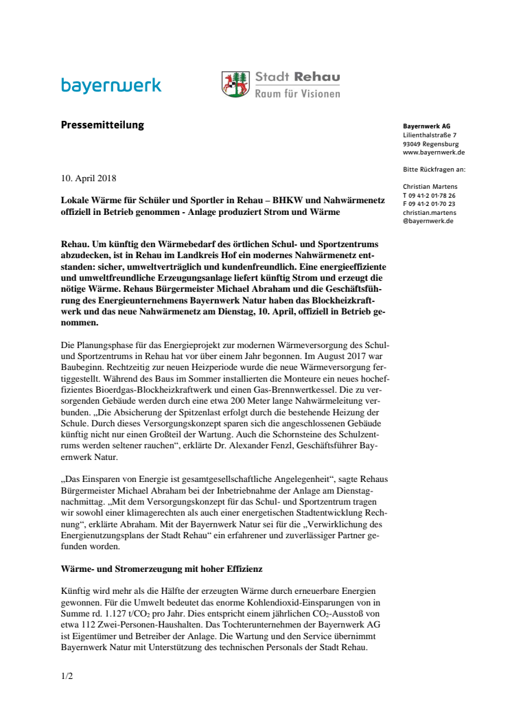 Um künftig den Wärmebedarf des örtlichen Schul- und Sportzentrums abzudecken, ist in Rehau im Landkreis Hof ein modernes Nahwärmenetz entstanden. Eine energieeffiziente Erzeugungsanlage liefert künftig Strom und Wärme. Rehaus Bürgermeister Michael Abraham und Bayernwerk Natur haben das Blockheizkraftwerk und das neue Nahwärmenetz am Dienstag, 10. April, offiziell in Betrieb genommen.