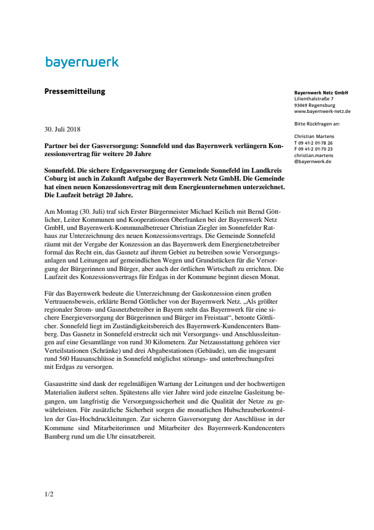 Sonnefeld. Die sichere Erdgasversorgung der Gemeinde Sonnefeld im Land-kreis Coburg ist auch in Zukunft Aufgabe der Bayernwerk Netz GmbH. Die Gemeinde hat einen neuen Konzessionsvertrag mit dem Energieunternehmen unterzeichnet. Die Laufzeit beträgt 20 Jahre.