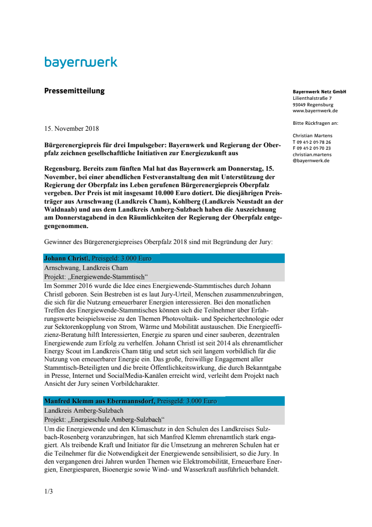 Bereits zum fünften Mal hat das Bayernwerk am Donnerstag, 15. November, den mit Unterstützung der Regierung der Oberpfalz ins Leben gerufenen Bürgerenergiepreis Oberpfalz vergeben. Der Preis ist mit insgesamt 10.000 Euro dotiert. Die diesjährigen Preisträger kommen aus den Landkreisen Cham, Neustadt an der Waldnaab und Amberg-Sulzbach.