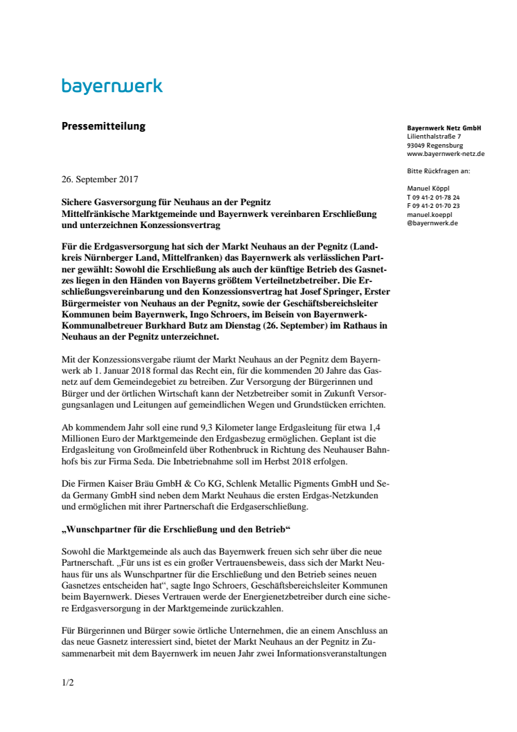 Sichere Gasversorgung für Neuhaus an der Pegnitz