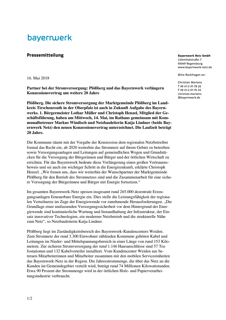 Die sichere Stromversorgung der Marktgemeinde Plößberg (LK Tirschenreuth) bleibt 20 weitere Jahre Aufgabe des Bayernwerks. 1. Bürgermeister Lothar Müller und Christoph Henzel, Mitglied der Geschäftsführung, haben am Mittwoch, 14. Mai, im Rathaus gemeinsam mit Kommunalbetreuer Markus Windisch und Netzbauleiterin Katja Lindner (beide Bayernwerk Netz) den neuen Konzessionsvertrag unterzeichnet.