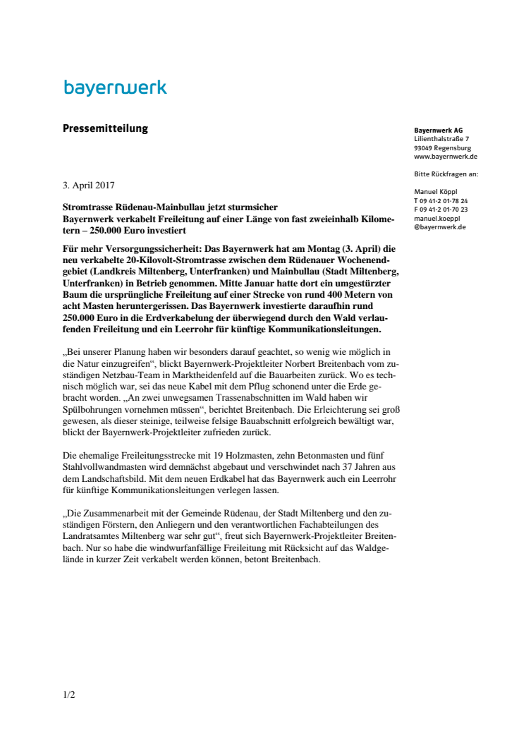 Das Bayernwerk hat am Montag (3. April) die neu verkabelte 20-Kilovolt-Stromtrasse zwischen dem Rüdenauer Wochenendgebiet (Landkreis Miltenberg, Unterfranken) und Mainbullau (Stadt Miltenberg, Unterfranken) in Betrieb genommen. Mitte Januar hatte dort ein umgestürzter Baum die ursprüngliche Freileitung heruntergerissen. Das Bayernwerk investierte daraufhin rund 250.000 Euro in die Erdverkabelung.