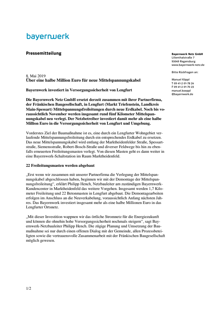 Bayernwerk investiert in Versorgungssicherheit von Lengfurt
