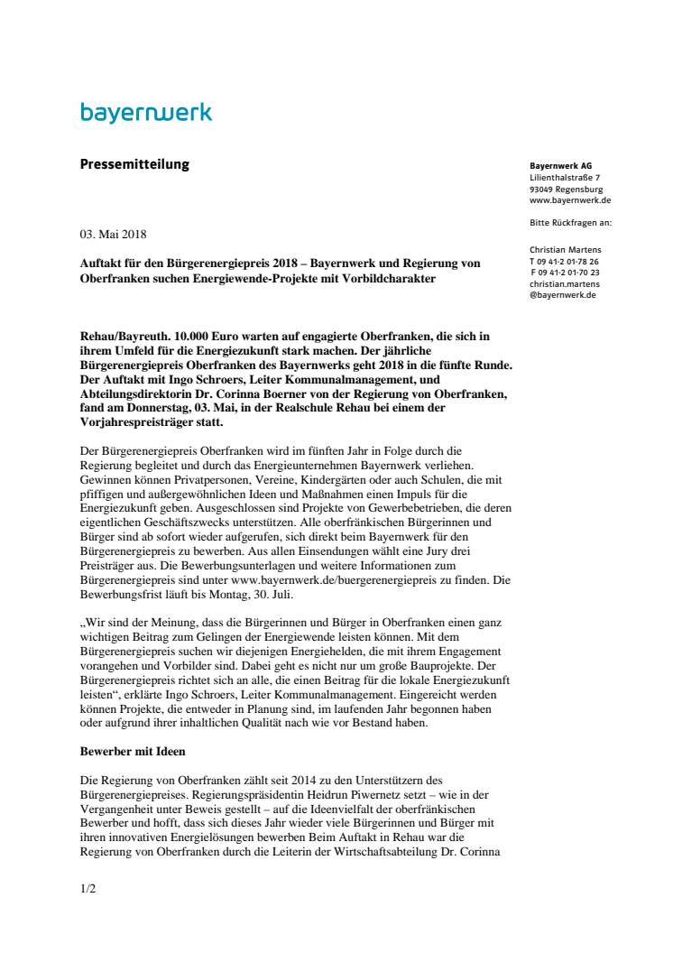 10.000 Euro warten auf engagierte Oberfranken, die sich in ihrem Umfeld für die Energiezukunft stark machen. Der Auftakt für den Bürgerenergiepreis Oberfranken 2018 mit Ingo Schroers, Leiter Kommunalmanagement, und Abteilungsdirektorin Dr. Corinna Boerner von der Regierung von Oberfranken, fand am Donnerstag, 03. Mai, in der Realschule Rehau bei einem der Vorjahrespreisträger statt.