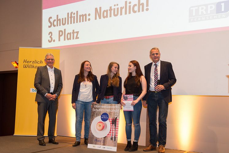 Filmtagleiter Ralph Thoms, Lehrerin Susanne Kromm, Schülerinnen der 10. Klasse des Gymnasiums Zwiesel und Christoph Henzel, Leiter des Kommunalmanagements des Bayernwerks, bei der Gewinnübergabe (v.l.).