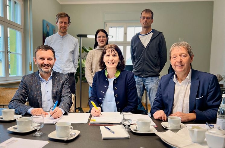 Auftakt zur Kommunalen Wärmeplanung im Rathaus (vorne, v. li.): Bürgermeister Markus Hofmann mit Christina Albrecht und Johann Seebauer (Bayernwerk Netz GmbH). Dahinter (v.li.) Nils Schild (INEV), Maya Joachimstaller (Bauamt) und Geschäftsleiter Karl-Heinz Lummer.