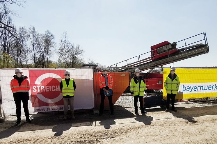 Netzbau unter der Isar mit einem Spezialbohrer: Vertreter von der Bayernwerk Netz, der Firma Streicher und der Stadtwerke in Plattling auf der Baustelle. Zur Stärkung des Stromnetzes in Plattling und zur künftigen Integration erneuerbarer Energien werden Leitungen unter der Isar verlegt. v.l.: Markus Lallinger (Bauleiter Netzbau Streicher), Roland Riedl (Bauleiter Spülbohrung Streicher), Boris Böhm (Marketing Streicher), Simon Strasser (LER Bayernwerk), Fabian Brunner (Teamleiter Netzbau Vilshofen)