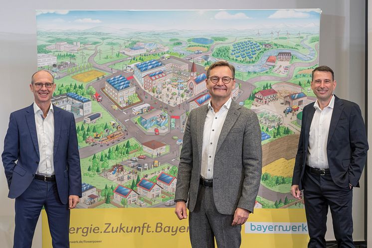 v.l.: Die Bayernwerk-Vorstände Dr. Egon Leo Westphal, Reimund Gotzel (Vorsitzender) und Andreas Ladda vor der „Flower-Power“-Illustration, die das Energiesystem der Zukunft darstellt.
