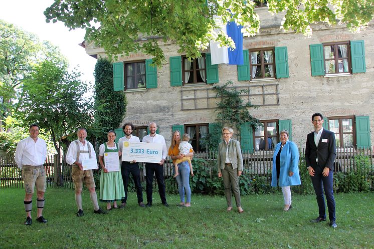 v.l.n.r.: 1. Bürgermeister Markus Huber, die Preisträger Johann und Maria Furtmayr mit der Familie, Regierungspräsidentin Maria Els, Landrätin Andrea Jochner-Weiß und Markus Leczycki, Bayernwerk