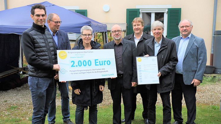 Kosteneffizient saniert: Preisträger Familie Kawohl aus Hiltpoltstein: von links nach rechts: Markus Leczycki, Leiter Kommunalmanagement der Bayernwerk Netz GmbH, 2. Bürgermeister von Hiltpoltstein Georg Potzner, Birgit Kawohl, Dietrich Kawohl, Ralf Schwarz (Bayernwerk), Regierungsvizepräsident Thomas Engel, stellvertretender Landrat Otto Siebenhaar, Landkreis Forchheim.