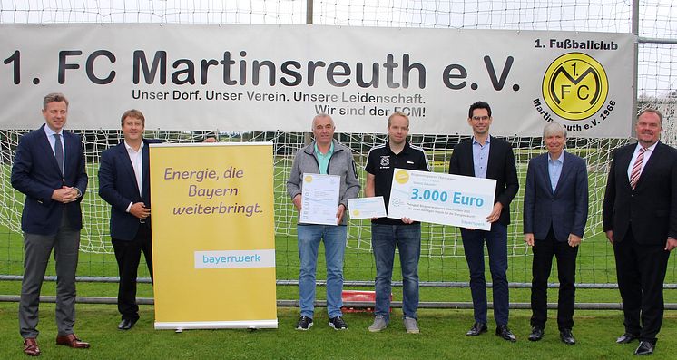 Landrat Dr. Oliver Bär, Ralf Schwarz (Bayernwerk), Manfred Barthold (1. Vorsitzender Martinsreuther Dorfverein), Marco Mergner (1. Vorsitzender 1. FC Martinsreuth e. V.), Markus Leczycki (Bayernwerk), Regierungsvizepräsident Thomas Engel, 1. Bürgermeister Matthias Döhla von Konradtsreuth.