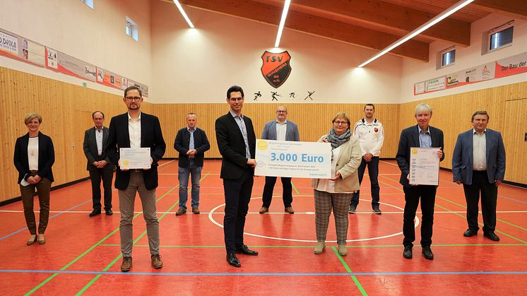 Energetische Maßnahmen für den Sportverein. Preisträger TSV Windheim (Landkreis Kronach): von links nach rechts: Nicole Föhrweiser (TSV Windheim), Edgar Müller (Bayernwerk), Andreas Trebes (TSV Windheim ), 1. Bürgermeister Thomas Löffler von Steinbach a. Wald, Markus Leczycki (Bayernwerk), Matthias Neubauer (TSV Windheim), 1. Vorsitzende des TSV Windheim Heidi Vetterdietz, Matthias Trebes (TSV Windheim), Regierungsvizepräsident Thomas Engel, stellvertretender Landrat Gerhard Löffler.