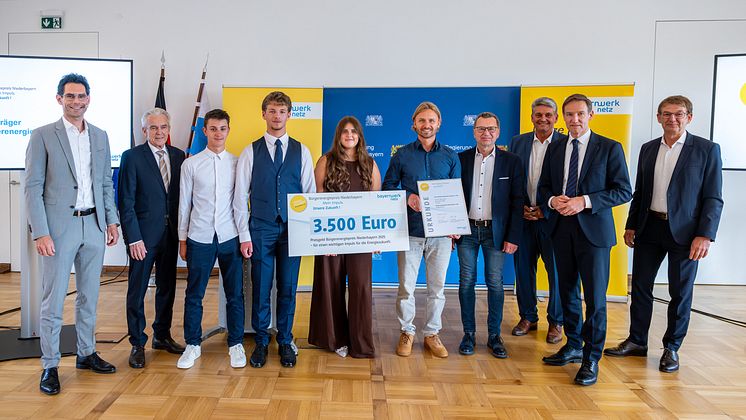 von links nach rechts: Markus Leczycki, Leiter Kommunalmanagement Bayernwerk Netz GmbH, Stellv. Landrat Landkreis Landshut Fritz Wittmann, Cassian Toma, Alexander Seidl, Sophie Okwiek (alle Schülersprecher der Realschule Neufahrn i.NB), Simon Bauer (Lehrer und BNE-Beauftragter) Schulleiter Hermann Schneider, 1. Bürgermeister Neufahrn i. NB Peter Forstner, Regierungspräsident von Niederbayern Rainer Haselbeck und Ministerialbeauftragter für Realschulen, Manfred Brodschelm