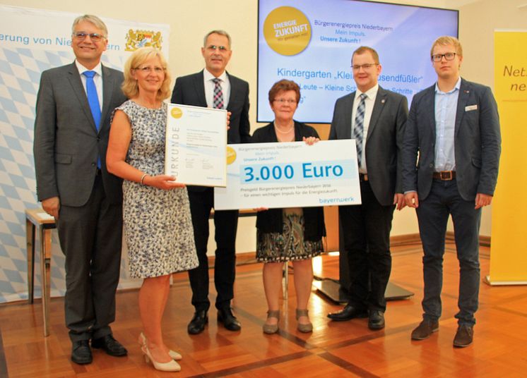 Zu den Gewinnern zählt der Kindergarten „Kleiner Tausendfüssler" aus Drachselsried (Landkreis Regen) mit dem Projekt „Kleine Leute – Kleine Schritte! Kleine Schritte – große Wirkung!“. Foto v.l.: Regierungsvizepräsident Dr. Helmut Graf, Martina Kufner (beide Kindergarten), Christoph Henzel (Kommunalmanagement Bayernwerk), Bürgermeister Johann Hutter und Energiemanager Andreas Ritzinger.