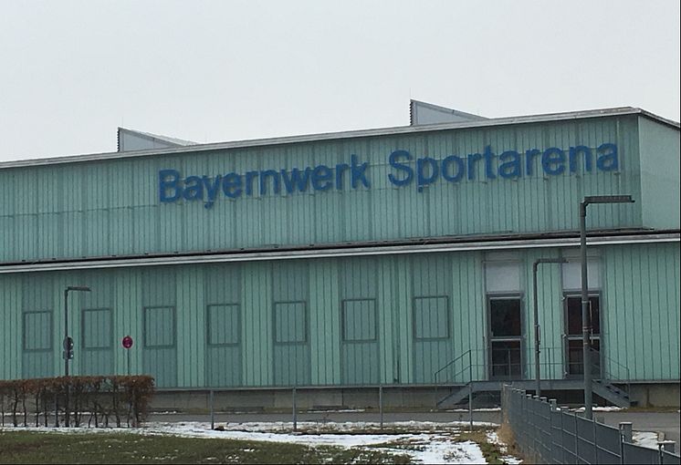 In blauen „Lettern“ ist der neue Name „Bayernwerk-Sportarena“ an der Gebäudefassade angebracht.