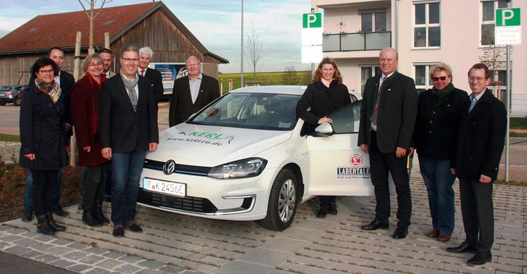 Landrätin Tanja Schweiger (vierte von rechts), Vorstandsvorsitzende der KERL eG, und Bayernwerk-Regionalleiter Dr. Andé Zorger (rechts), übergaben zusammen mit zahlreichen Gästen den VW E-Golf am Standort Schierling.