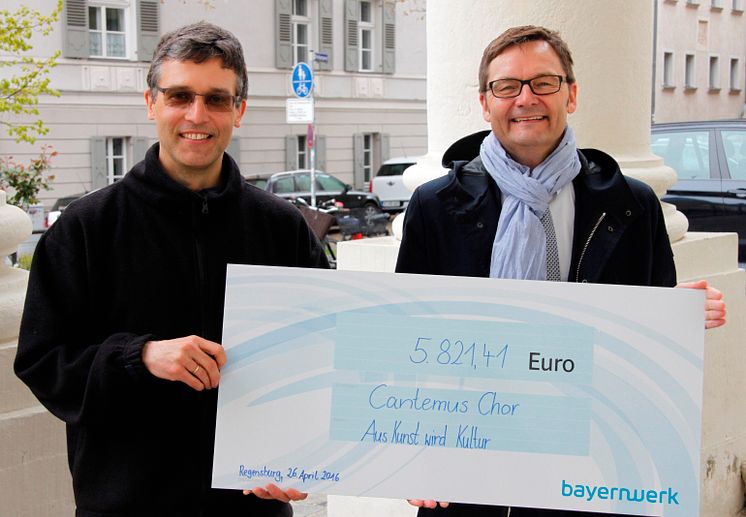 Chorleiter, Matthias Schlier, freute sich über den Scheck mit dem krummen Spendenbetrag, den der Vorstandsvorsitzende des Bayernwerks, Reimund Gotzel, überreichte. (von links)