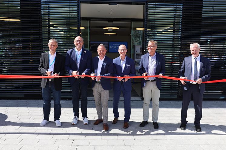 Offizielle Einweihung des Bamberger Sonnenhauses: Bayerns Umweltminister Thorsten Glauber (3.v.li.) und Bayernwerk-Vorstandsvorsitzender Dr. Egon Leo Westphal (3.v.re.) sowie (v.li.) Projektleiter Thomas Richter, Betriebsrat Gerhard Lehner, Oberbürgermeister An-dreas Starke und stellvertretender Landrat Bruno Kellner.