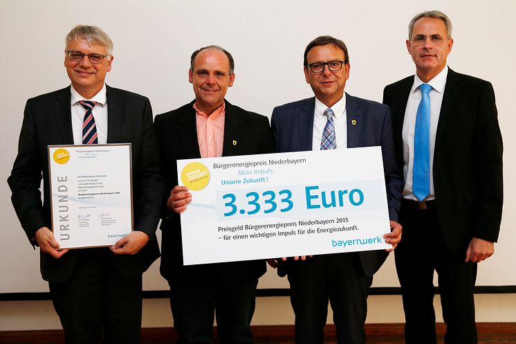 Alois Pinzl (2. von links) von der Mittelschule Viechtach nimmt auch stellvertretend für die Schüler den Bürgerenergiepreis Niederbayern 2015 entgegen. Regierungsvizepräsident Dr. Helmut Graf, Bürgermeister Franz Wittmann und Christoph Henzel, Leiter Kommunalmanagement beim Bayernwerk, gratulieren am Donnerstag in Landshut bei der Preisverleihung dem Gewinner.