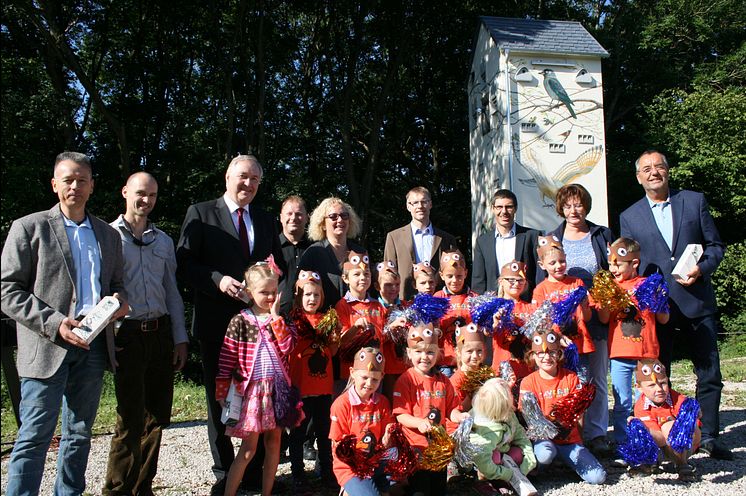 Foto: Die Mädchen und Buben des Maintal-Kindergartens in Schönbrunn haben die Patenschaft für den Artenschutz-Turm übernommen.