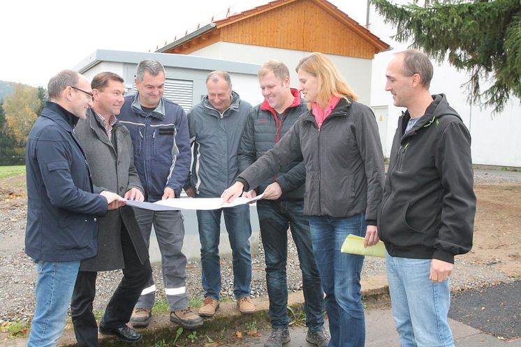 Auf dem Bild von links nach rechts: Amtsleiter Günter Gschwindler, Bürgermeister Rainer Rewitzer, Baubegleiter Thomas Prem, Projektverantwortlicher Karl Schwanitz, Andreas Gruber von derausführenden Baufirma Blödt, Bayernwerk-Netzbauleiterin Katja Linder , Projektverantwortlicher Peter Pischel.