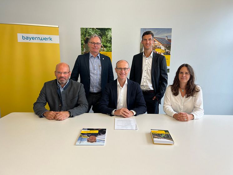 Ein starkes Team für die Energiewende (vorne, v.li.): Prof. Dr. Dominikus Bücker (Gründer des INEV), Dr. Egon Leo Westphal, Vorstandsvorsitzender der Bayernwerk AG, und Dr. Isabel Bücker (Gründerin des INEV). Dahinter (v.li.) INEV-Geschäftsführer Ludger Bottermann und Matthias Löhlein, Bereichsleiter Unternehmensentwicklung, Digitalisierung & Nachhaltigkeit bei der Bayernwerk AG.