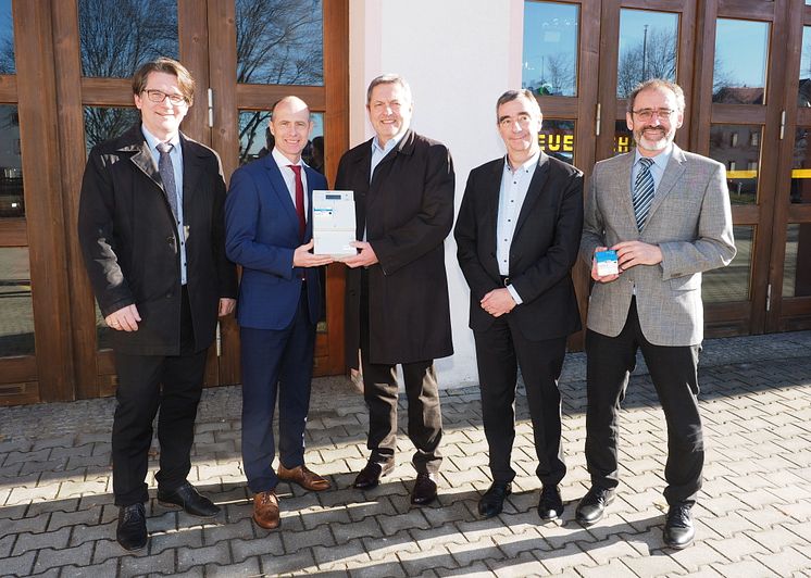 Das erste intelligente Messsystem geht in Auerbach in Betrieb. Dr. Egon Westphal, Technikvorstand des Bayernwerks (2.vl.), und Joachim Neuss, Bürgermeister Auerbach (Mitte), geben den Startschuss für die Zukunftstechnologie. Technikvorstand Dr. Egon Westphal, Dr. Roland Hofer, Experte Messstellenbetrieb (2.vr.), Ansgar Wetzel, Leiter Messstellenbetrieb (rechts), sowie Kommunalbetreuer Markus Windisch (links) stellen die Technik des Smart Meters vor.