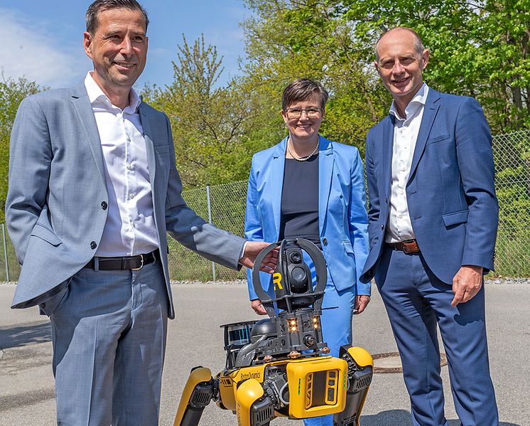 Andreas Ladda, Melanie Wiese und Dr. Egon Leo Westphal (rechts) mit Laufroboter „BASTI“, der künftig Umspannwerksanlagen des Unternehmens mit überwacht.