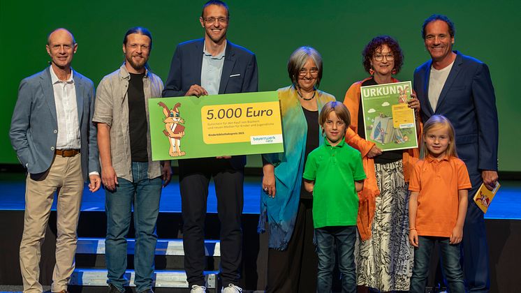 Kinderbibliothekspreis 2023 - Preisträger Dörfles-Esbach: von links nach rchts: Bayerwerk-Chef Dr. Egon Leo Westphal, Matthias Mauer (Bürgerhaus Dörfles-Esbach), Torsten Dohnalek (Bürgermeister Dörfles-Esbach), Ministerialrätin Dr. Elisabeth Donoughue, Elke Bauer (Leiterin Gemeindebücherei Dörfles-Esbach), Moderator Thomas Ohrner. Vorne: Bühnenkinder David und Anna.