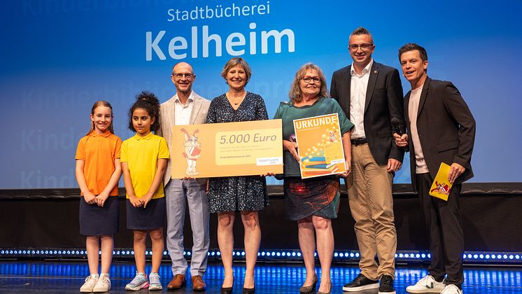 (v.l.) Anna Pree und Aylin Aydogan (beide 9 Jahre alt) unterstützten auf der Bühne und brachten die Urkunde und den symbolischen Scheck für die Preisträger, Bayernwerk-Chef Dr. Egon Leo Westphal, Büchereileiterin Liane Ehrl mit Kollegin Eva Saller, 2. Bürgermeister Dennis Diermeier und Moderator Dennis Diermeier.