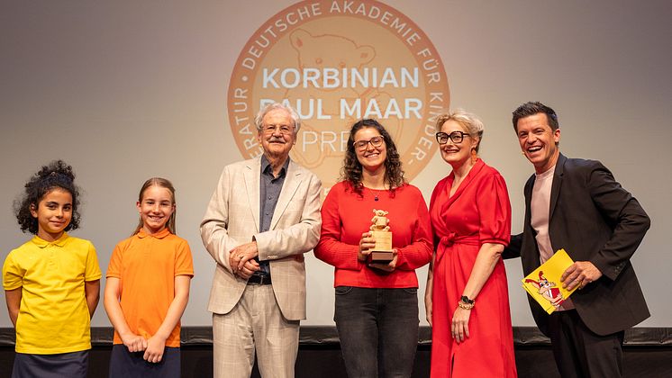von links: Aylin Aydogan und Anna Pree (beide 9 Jahre alt) unterstützten auf der Bühne, Autor Paul Maar, Preisträgerin Anna Dimitrova („People Pleaser – Eine für alle und alle für sich“), Dr. Claudia Maria Pecher, Präsidentin der Deutschen Akademie für Kinder - und Jugendliteratur e. V., Moderator Benedikt Weber