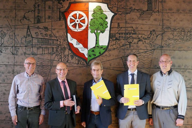 Die Bayernwerk Netz GmbH (Bayernwerk) wird in Elsenfeld die nächsten 20 Jahre die Stromnetze betreiben. Bürgermeister Matthias Luxem (M.) und Kämmerer Kai Hohmann (r.) von Markt Elsenfeld, sowie Ingo Schroers (2.v.r.), Mitglied der Geschäftsführung Bayernwerk Netz GmbH, stellvertretender Regionalleiter Günter Jira (2.v.l.) und Joachim Stark (l.), Servicetechniker, Bayernwerk Netz, bei der Konzessionsvertragsunterzeichnung.