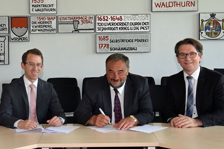 Dr. André Zorger, (Bayernwerk Netz), Bürgermeister Josef Beimler und Kommunalmanager Markus Windisch (v.l.) unterzeichnen den neuen Konzessionsvertrag.