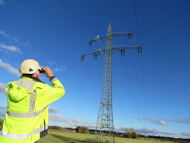 Arbeiter reinigen einen Hochspannungsmasten, hier an einer Leitung bei Burgkirchen an der Alz (2020)
