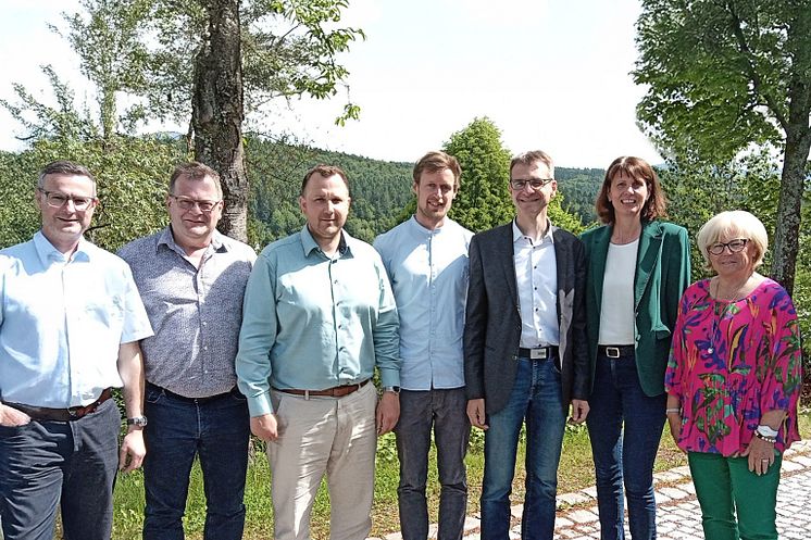 Besprachen erste Ergebnisse der Kommunalen Wärmeplanung (v.li.): Bürgermeister Andreas Waiblinger (St. Oswald-Riedlhütte), Bürgermeister Fritz Schreder (Frauenau), ILE-Geschäftsführer Sebastian Biereder, Nils Schild (Institut für nachhaltige Energieversorgung), ILE-Vorsitzender Karlheinz Roth, KWP-Managerin Christina Albrecht (Bayernwerk Netz GmbH) und Helga Weinberger, stellvertretende Landrätin im Landkreis Freyung-Grafenau.