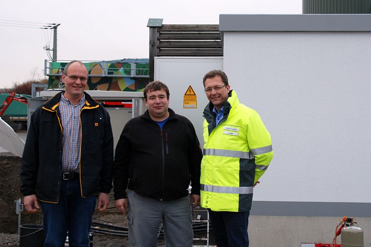 Marco Seith, Geschäftsführer der Agrokraft Großbardorf, begleitet mit Projektleiter Holger Lube und Jürgen Lehner (von links) vom Bayernwerk die letzten Schritte vor der Inbetriebnahme der Station.