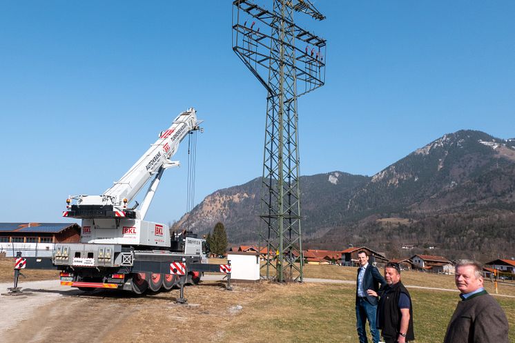 Die Bayernwerk Netz GmbH hat am Mittwoch, 24. Februar, den letzten Strommast einer Freileitung in Unterwössen abgebaut. Eine neue Erdkabelleitung sichert die Versorgung im regionalen Verteilnetz. Den Einsatz eines Autokrans begleiteten Bürgermeister Ludwig Entfellner, Servicetechniker Michael Summerer und Netzbauleiter Michael Mayr (beide Bayernwerk).