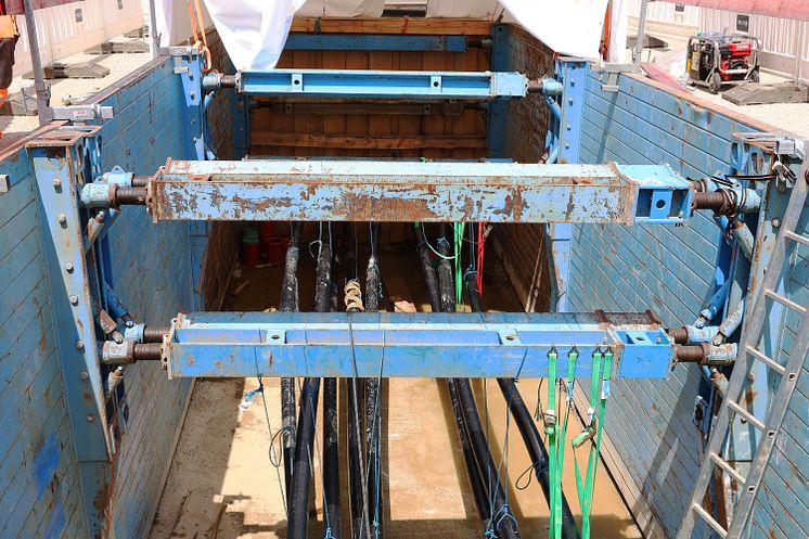 Die Arbeiten für den Neubau des Hochspannungskabels im Landkreis Dachau liegen im Zeitplan. Abschnittsweise werden die Kabel in die Leerrohre eingezogen, ehe sie in der Muffengrube zusammentreffen.