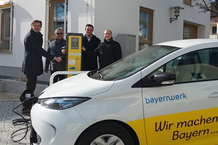 Albert Bortenhauser vom Bauamt und Florian Goß und Daniel Pangerl vom Bayernwerk (v.l.) nehmen die neue Ladesäule in Betrieb.