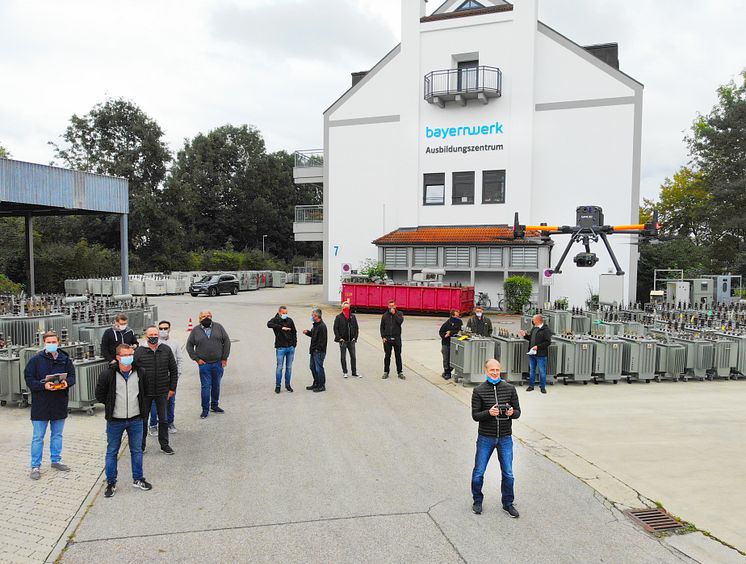 Flugschein für die Mitarbeiter - Um den Einsatz von Drohnen auf den Weg zu bringen, fand kürzlich am Standort Pfaffenh-ofen a.d.Ilm der Schulungsauftakt statt. In der Mitte Dr. Egon Leo Westphal, Technikvorstand des Bayernwerks.