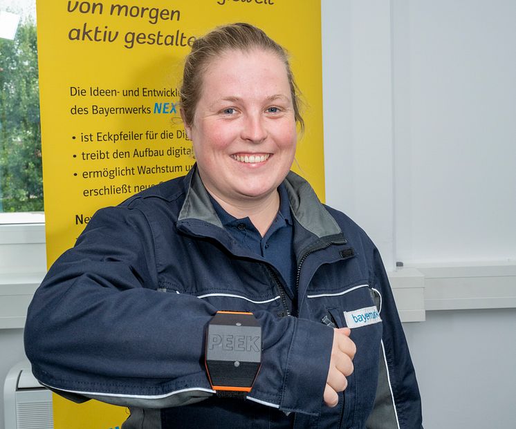 Bayernwerk-Servicetechnikerin Anna Goldbrunner trägt den PEEK-Sensor am Handgelenk. Die uhrenähnliche Neuentwicklung soll künftig vor potenziellen Stromunfällen warnen und stammt aus der Bayernwerk-Digitalisierungsplattform „NEXT“.