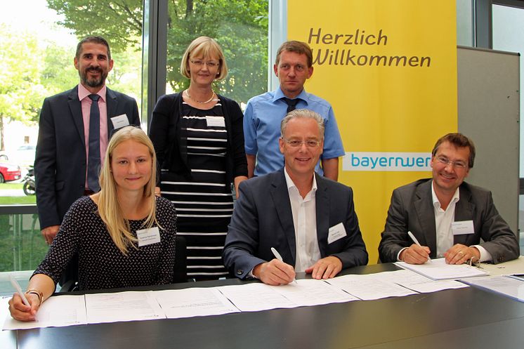 Unterschrift zur Gründung des neuen kommunalen Energieeffizienznetzwerks Südbayern beim Bayernwerk in München. Einer der insgesamt acht Teilnehmer ist die Gemeinde Petershausen im Landkreis Dachau.