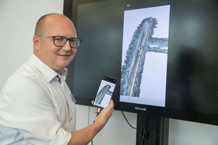 Markus Laußer, Bayernwerk-Projektleiter für das neue Vermessungssystem TrenchLog, mit einem 3 D-Bild einer Kabelinstallation. Das System und die verwendete Bilderkennung übertragen die aufgenommen Kabel umgehend in eine detaillierte 3 D-Darstellung und erstellt zeitgleich Vermessungspläne.