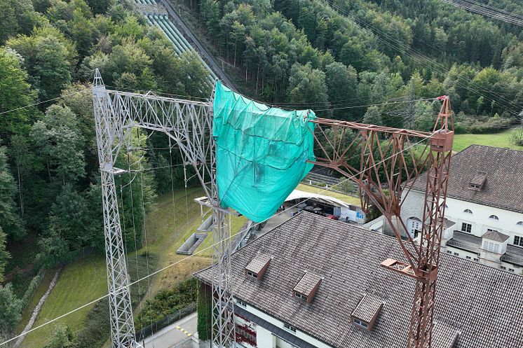 Die Bayernwerk Netz GmbH gibt dem Portal im Umspannwerk am Walchenseekraftwerk in Kochel am See einen frischen Anstrich. Spezialisten versehen die denkmalgeschützte Konstruktion mit spezieller Korrosionsschutzfarbe.