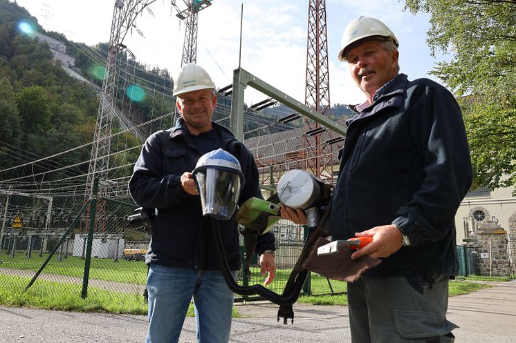 Projektleiter Christian Poppe (l.) und Servicetechniker Lorenz Demmel von der Bayernwerk Netz GmbH zeigen die Ausrüstung. Der Verteilnetzbetreiber gibt dem Portal im Umspannwerk am Walchenseekraftwerk in Kochel am See einen frischen Anstrich. Spezialisten versehen die denkmalgeschützte Konstruktion mit spezieller Korrosionsschutzfarbe.