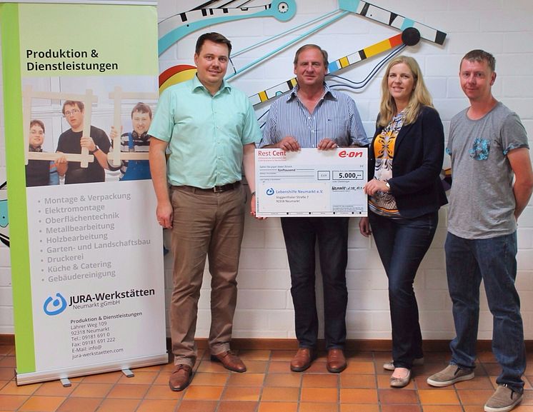 Tanja Kagerer (2. v. r.), Stellvertretende Betriebsratsvorsitzende der Bayernwerk Netz GmbH, überreichte die Spende gemeinsam mit ihren Bayernwerks-Kollegen an Sebastian Schauer (l.), den Bereichsleiter Arbeiten der Lebenshilfe Neumarkt.