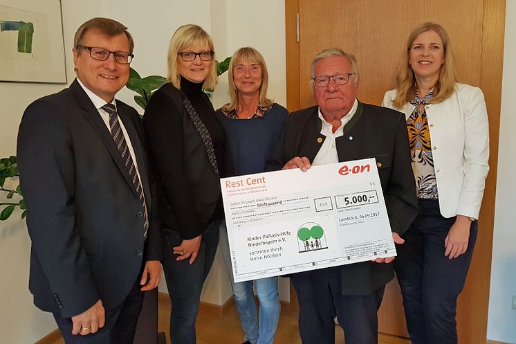 Der Mitarbeiter-Hilfsfond der E.ON SE unterstützt die Kinder-Palliativ-Hilfe Niederbayern. Von links: Manfred Westermeier (Geschäftsführer Bayernwerk Netz), Cathrin Praße-Stern (Betriebsrätin Bayernwerk), Isolde Bernhard (Betriebsratsvorsitzende e.kundenservice Netz), Manfred Hölzlein (Gründungsvorsitzender) und Tanja Kagerer (stv. Betriebsratsvorsitzende Bayernwerk).
