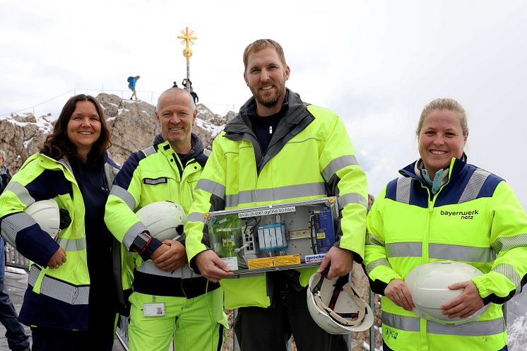 Der höchste Punkt Deutschlands auf der Zugspitze zählt zum Versorgungsgebiet der Bayernwerk Netz. Am Mittwoch, 30. Juli, hat der Netzbetreiber dort eine bestehende Ortsnetzstation (ONS) auf dem Gipfel mit digitaler Messtechnik nachgerüstet. Von links: Dr. Jennifer Mertens, Wolfgang Keller, Martin Haseneder und Anna Goldbrunner (alle Bayernwerk Netz) mit einer Retrofit-ONS Nachrüst-Box auf Gipfel der Zugspitze.