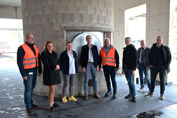 Richtfest des Bayernwerk-Neubaus in Bamberg: Dr. Daniela Groher, Finanzvorständin Bayernwerk AG (3.v.l.), und Dr. Joachim Kabs, Geschäftsführer Technik Bayernwerk Netz GmbH (4.v.l.), mit Claudia Donhauser, Geschäftsführerin Gebr. Donhauser Bau GmbH & Co.KG (2.v.l.) und Architekt Matthias Jacob (1.v.r.) vor dem Langzeit-Wärme- und Kältespeicher.